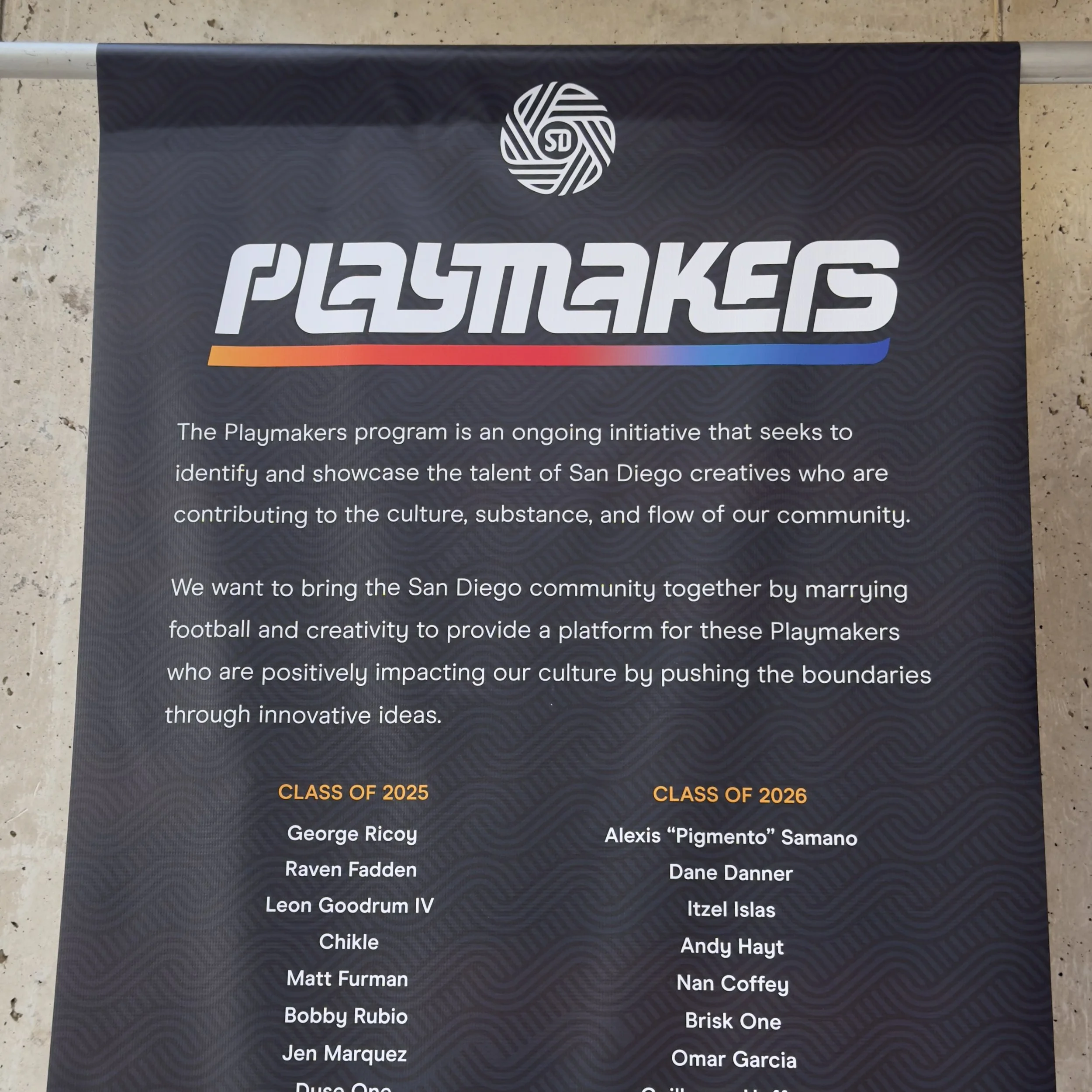 The Playmakers program brings the San Diego community together by marrying football and creativity, creating opportunities for paid projects, collaborations, and exposure for local talent. The logotype was designed to sit comfortably in that environment, acting as a clear banner across web, social, and program communications while keeping the focus on the artists and the work.